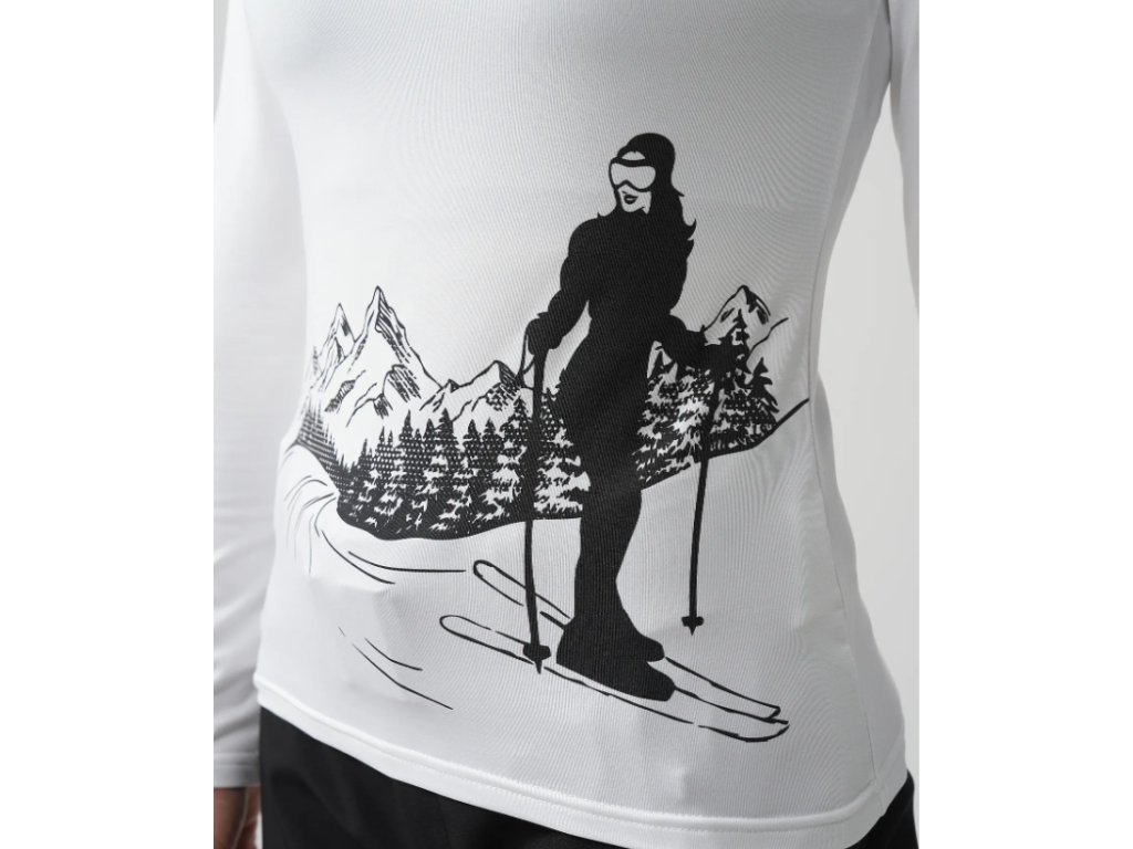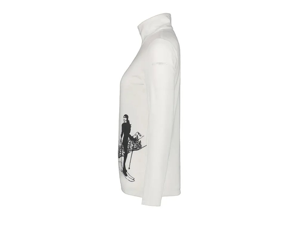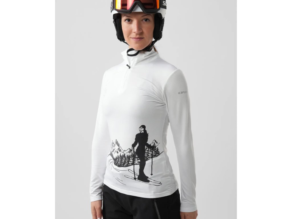 Dámské funkční triko Ellenton od značky Icepeak. Je vyrobeno z materiálu odvádějícího vlhkost a rychleschnoucí. Střih je úzký s krátkým 1/2 zipem, který sahá až ke stojáčku. Triko má tištěný design zimní motiv.