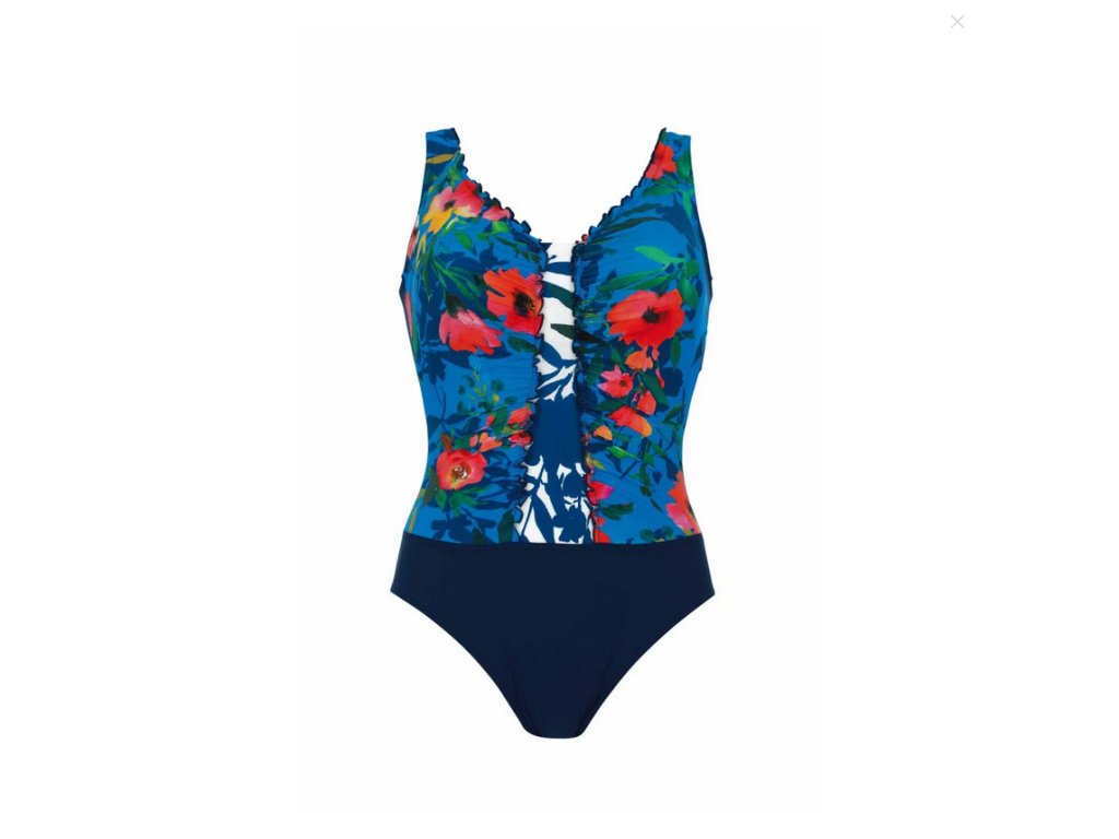 Jednodílné plavky bez kostice,s výztuhou a gumou pod prsy, ozdobné řasení na předním dílu, pevná ramínka.