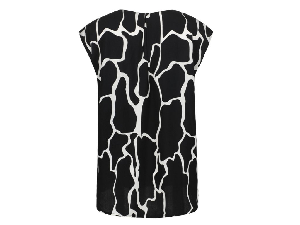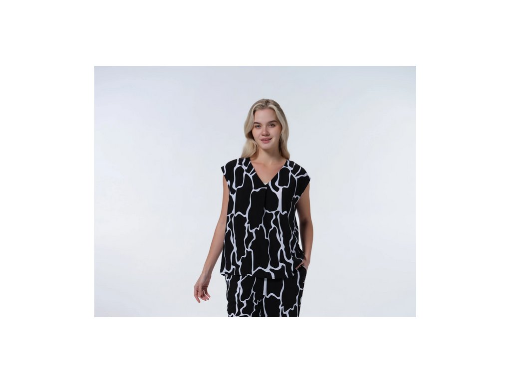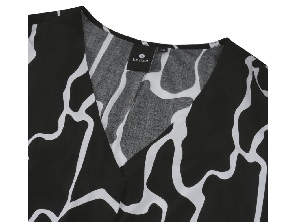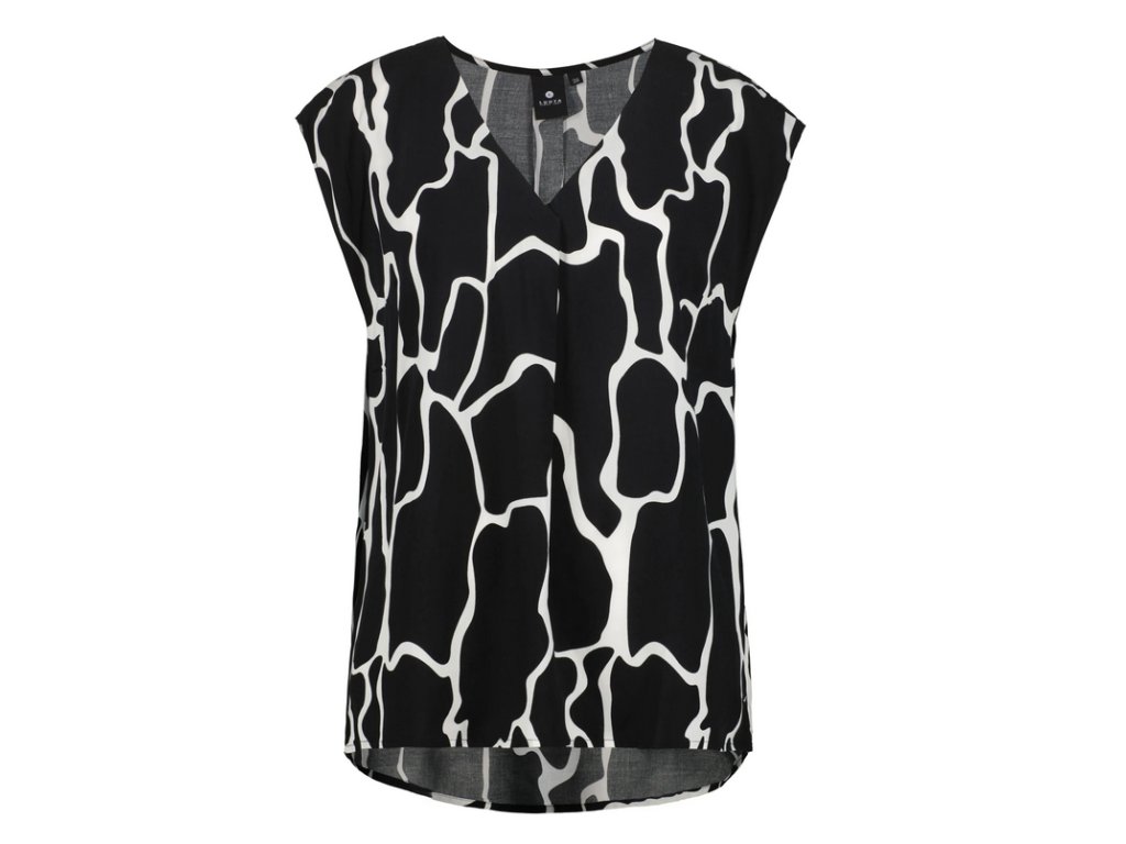 Dámský top Luhta. Výstřih do V. Zaoblený lem. Nášivka s logem. Potisk. Materiál je vyroben z obnovitelných surovin z udržitelných zdrojů. Obsahuje viskózová vlákna LENZING™ ECOVERO™, která jsou vyrobena z certifikovaného dřeva z udržitelných zdrojů s využitím ekologicky šetrné výrobní metody.