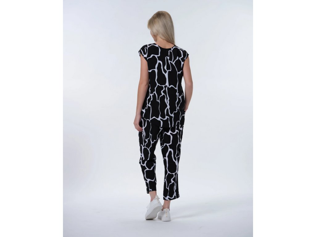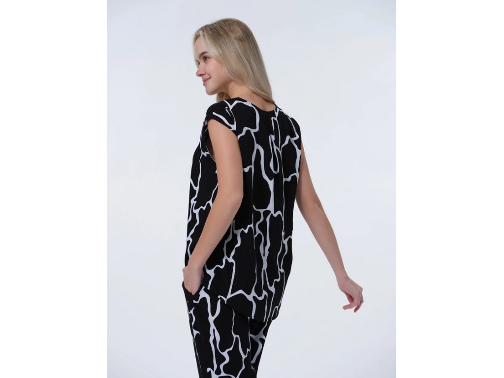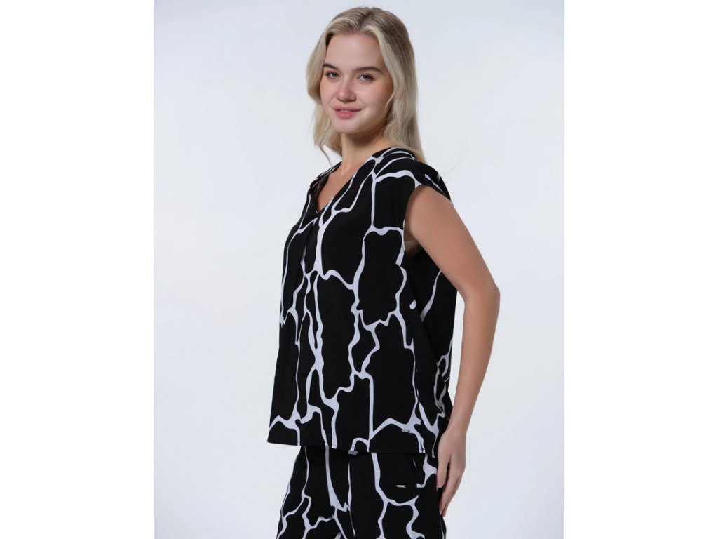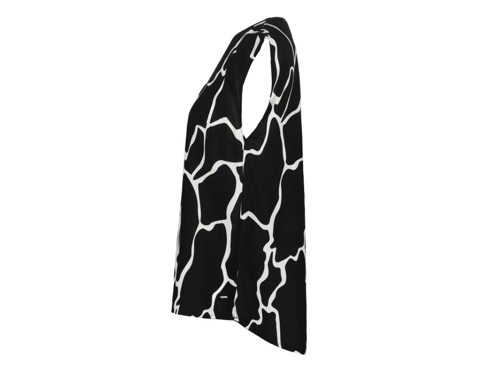 Dámský top Luhta. Výstřih do V. Zaoblený lem. Nášivka s logem. Potisk. Materiál je vyroben z obnovitelných surovin z udržitelných zdrojů. Obsahuje viskózová vlákna LENZING™ ECOVERO™, která jsou vyrobena z certifikovaného dřeva z udržitelných zdrojů s využitím ekologicky šetrné výrobní metody.