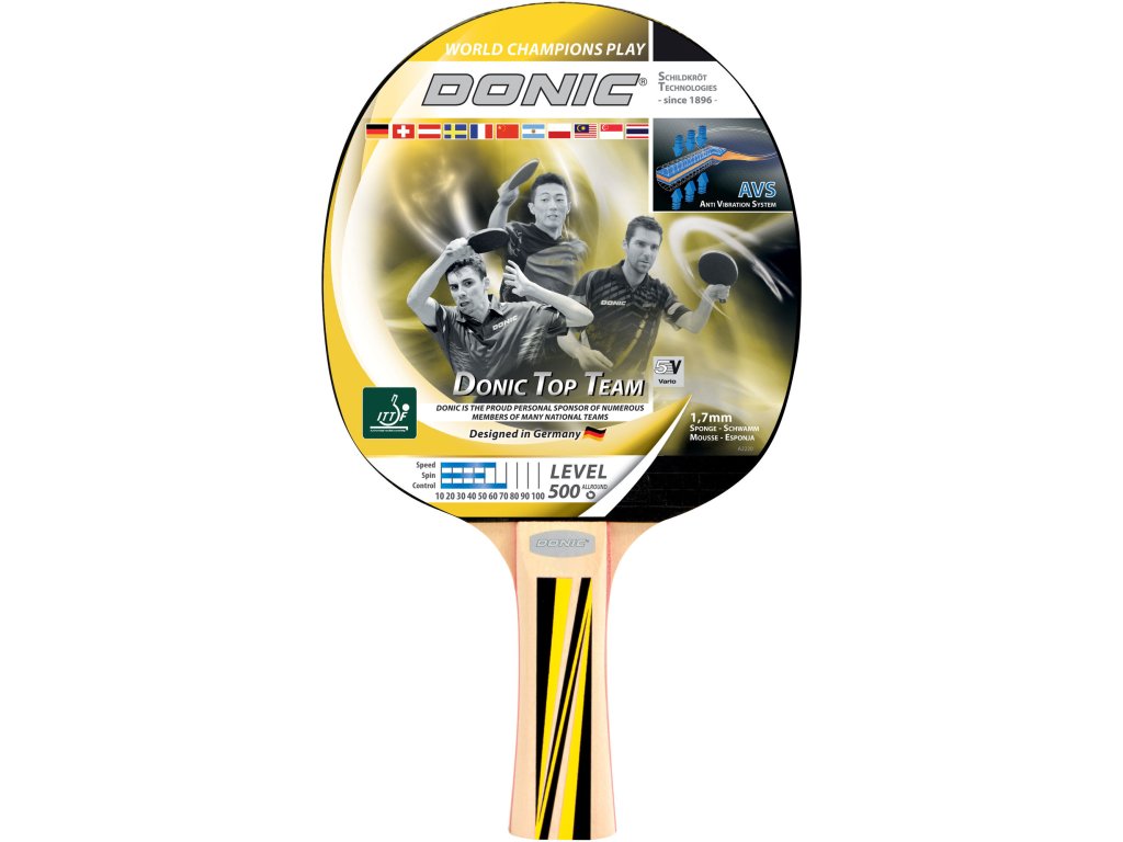 Pálka na stolní tenis Top Team 500 od společnosti DONIC je jednou z nejoblíbenějších pálek. Konkávní rukojeť umožňuje dobré držení v ruce a tím i flexibilní hru. Pálka je opatřena gumou xx. PLS (Power Light System) pro vyšší výkon a nižší hmotnost.